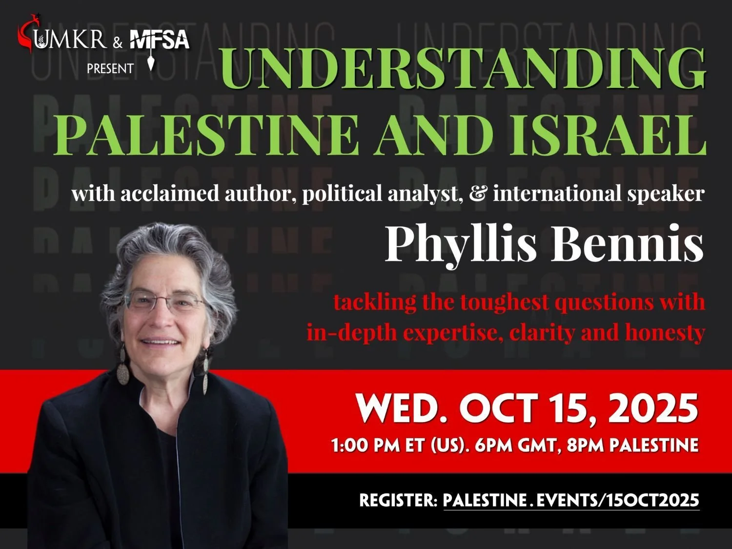 In this very special webinar, we will explore with her some of the most challenging questions that people around the world are grappling with, including: What are the root causes and the purpose of Israel's genocidal war that has raged since Oct 7, 2023? What should we know and understand about Hamas? In light of the ever-worsening horrors unfolding in Gaza, what are the most useful actions we can take? What to think of various plans that are arising for Gaza's future?