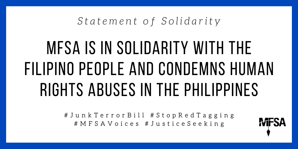 MFSA condemns the redtagging, intimidation, killings, and terrors committed by Duterte and by Duterte’s regime, and MFSA supports the Philippine Human Rights Act. Introduced last week in Congress, this legislation would “suspend United States security assistance to the Philippines until such time as human rights violations by Philippine security forces cease and the responsible state forces are held accountable.”